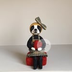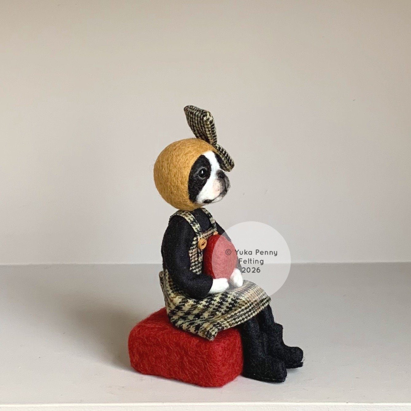 Needle Felted Boston Terrier Art Doll sitting on a felt cushion